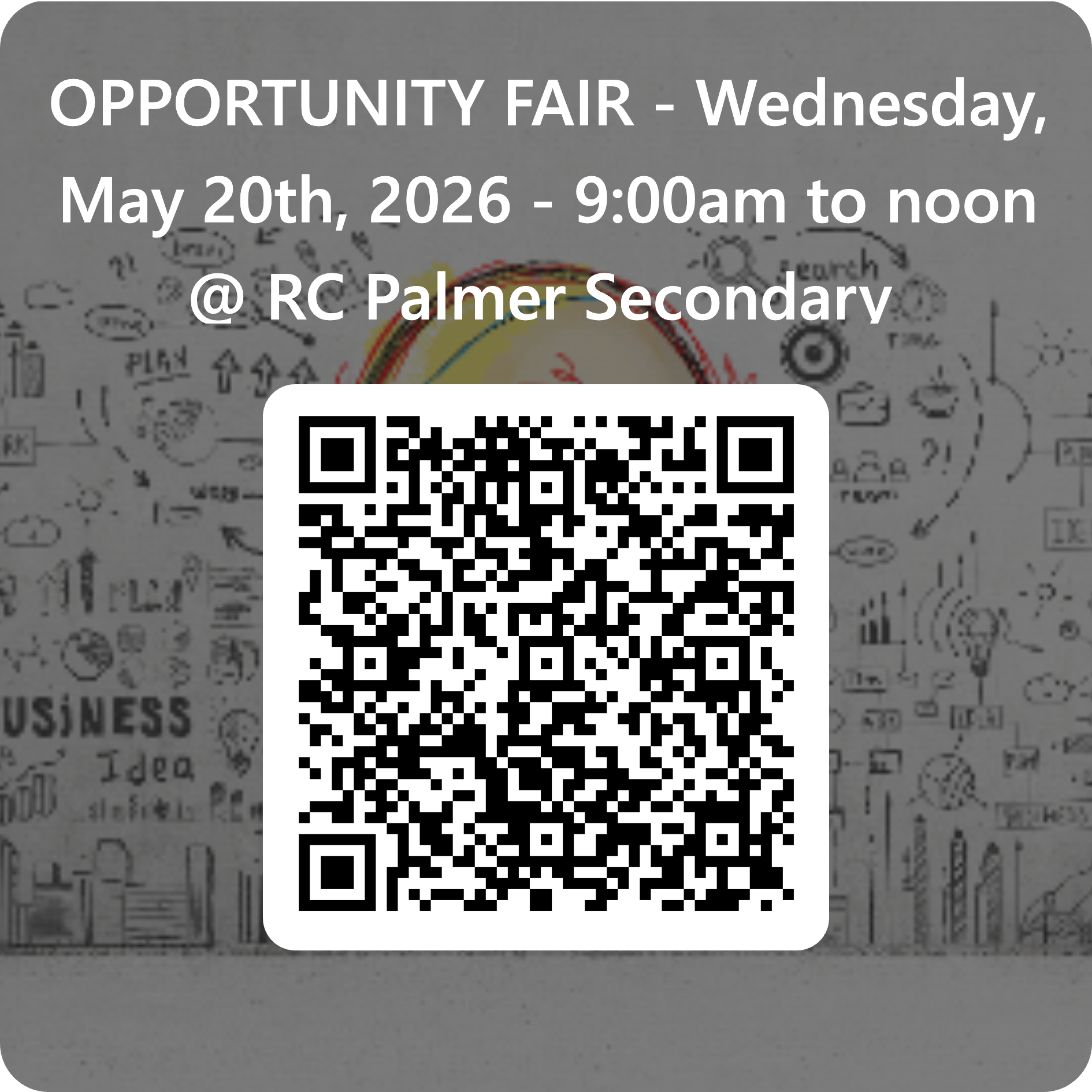 This event will take place Wednesday, May 20th, 2026 between 9:00am and 12:00noon at Palmer.  Selected students will be given a specific time to be at the Opportunity Fair site at RC Palmer Secondary School and will rotate between a few employers.